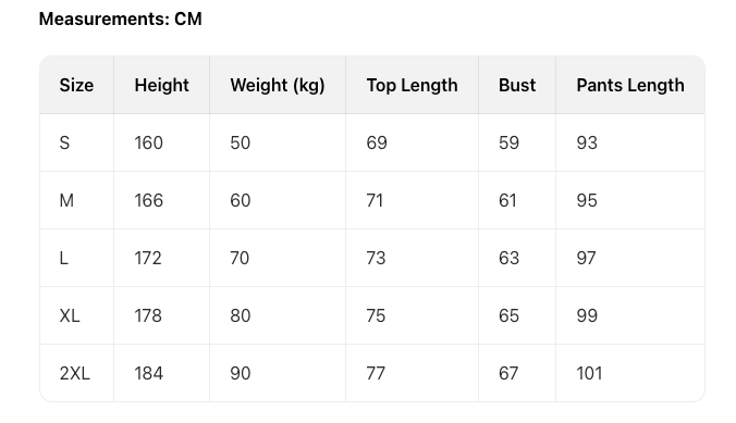 | Size | HEIGHT(CM) | TOP LENGTH(CM) | CHEST 1/2(CM) | WAIST(CM) | SLEEVE(CM) | PANTS LENGTH(CM) | Version | |